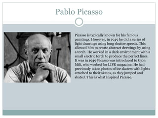 . Dec 10 2019 - Explore Bryant Ulloas board Pablo Picasso Light Drawing on Pinterest. Multiple exposure of artist Pablo Picasso using flashlight to make light drawing of a figure in the air that appears to be a man running. Multiple exposure of artist Pablo Picasso using flashlight to make light.